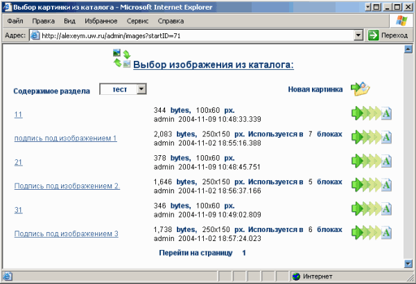 Для того, чтобы посмотреть картинку – нажмите на ссылку с ее названием. Чтобы добавить интересующую картинку в блок "Текст с Картинкой" нажмите на кнопку "