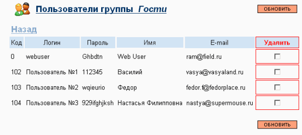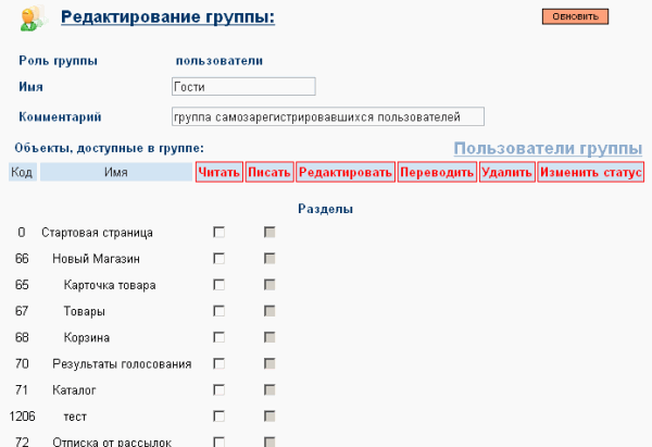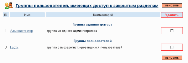 - удалить – флажок, позволяющий пометить группу на удаление. Для того, чтобы удалить группу, следует поднять этот флажок против имени нужной группы и нажать кнопку “обновить” - все помеченные группы будут удалены. Пользователи из этих групп (если они не являются членами других групп) будут автоматически перемещены в группу “Гости”.