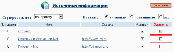 Для удаления источника, отметьте источник в столбце "удалить" и нажмите на кнопку "обновить"