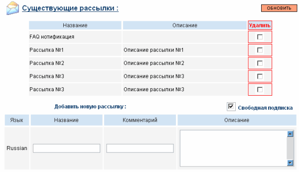 - Удалить – содержит флажки, используемые для пометки данной рассылки на удаление. Для того, что бы удалить все помеченные рассылки, необходимо нажать кнопку “обновить”, расположенную слева над таблицей.