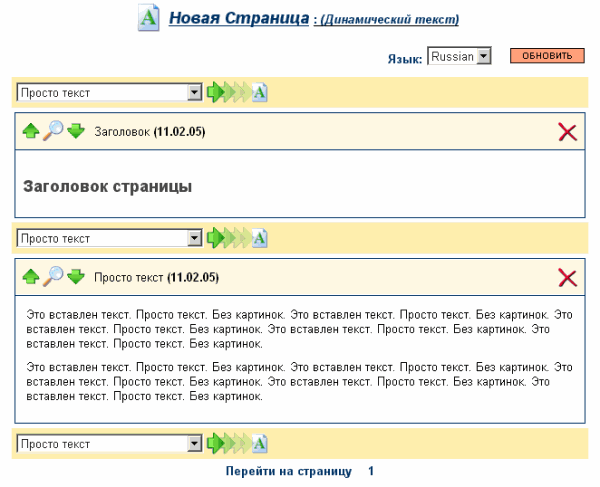 Форма для редактирования раздела данного типа представляет собой список имеющихся блоков, которые можно изменять, удалять и изменять их положение в списке. Эти операции выполняются соответствующими кнопками:
